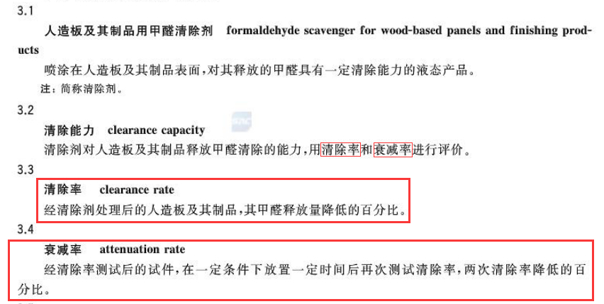 根據國家標準,驗證人造板甲醛清除劑的清除能力的有兩個指標非常重要,一個是測定24小時效果的“甲醛清除率”,還有一個測定長期效果的“衰減率”。“衰減率”就是在7天之后,再測一次甲醛清除率,然后把7天后的甲醛清除率與24小時的甲醛清除率作比較,看前后兩次清除甲醛的效果降低了多少,計算出來的降低比率就是“衰減率”。
