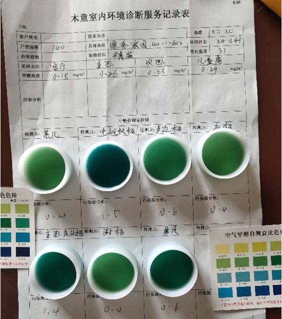 業(yè)主家新裝修完6個(gè)多月,入住時(shí)感覺有明顯不適的異味,身體不舒服,懷疑是裝修污染造成。通過查詢對(duì)比,找到濟(jì)南木童來為其提供室內(nèi)除甲醛服務(wù)。經(jīng)木童工程師上門診斷,確定業(yè)主家主要甲醛污染來源于裝修中使用的家具內(nèi),需要采用木童人造板甲醛清除劑——強(qiáng)力除醛劑第三代、家具甲醛清除劑等進(jìn)行治理。異味來源于油漆家具以及生態(tài)板家具上采用木童家具除味劑進(jìn)行全面徹底治理。