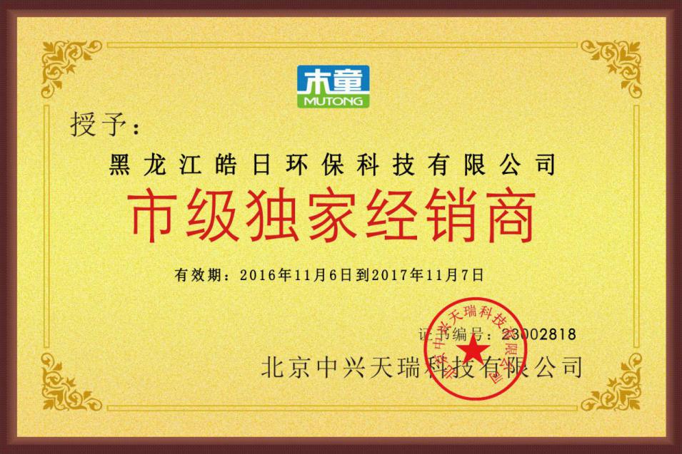 北京中興天瑞旗下木童除甲醛產品市級獨家經銷商證書